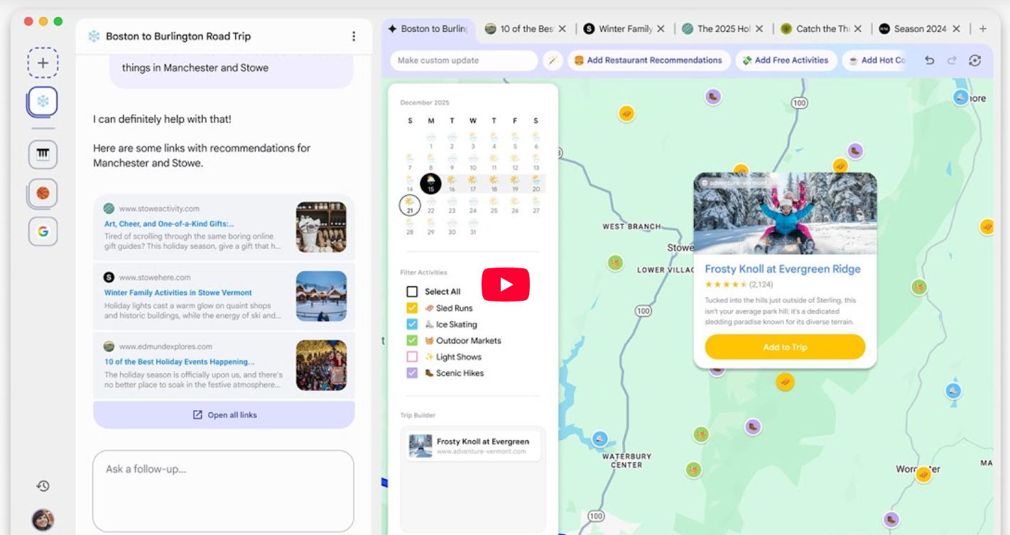 구글이 제미나이 모델 기반의 실험적 브라우저 디스코(Disco)와 젠탭(GenTabs) 기능을 11일(현지시각) 발표했다. 이 기능은 현재 구글 랩스(Google Labs)를 통해 맥OS 사용자 일부를 대상으로 제한적 테스트 중이며, 향후 크롬 등 주요 제품에 통합될 가능성도 열려 있다.