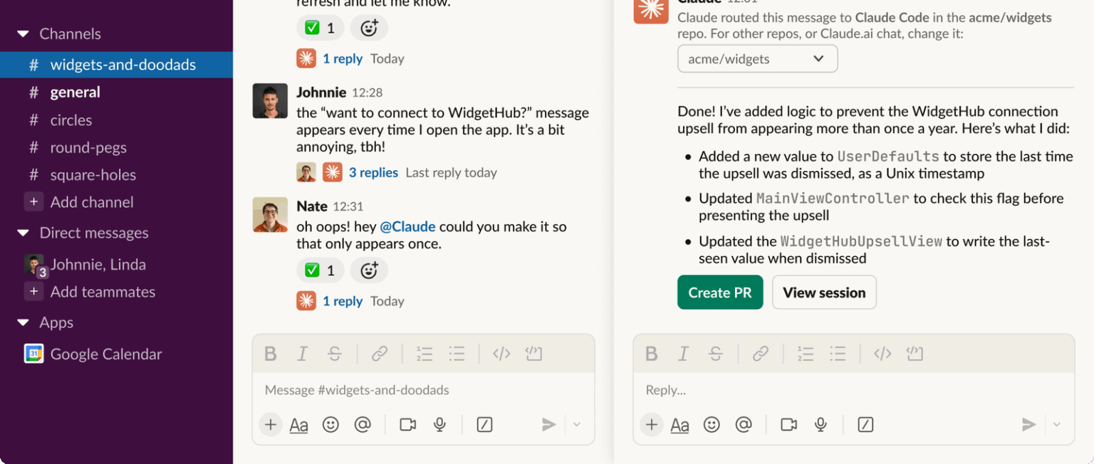 슬랙에서의 클로드 코드 통합은 사용자가 @Claude를 태그하여 대화를 분석하고, 적절한 코드 리포지토리를 식별하여 자동으로 PR 링크를 생성하는 기능을 제공한다. 이 과정에서 슬랙 대화의 컨텍스트와 인증된 코드 저장소의 맥락을 활용하여 코드 작업을 자동화한다. 이는 슬랙과 클로드 코드 간의 수동 컨텍스트 복사를 자동화하여 워크플로우를 간소화하는 데 큰 기여를 한다.